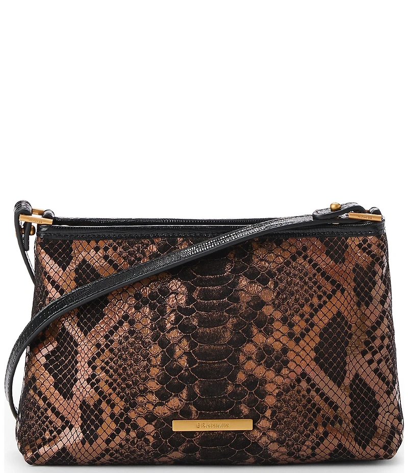 From BRAHMIN, this shoulder bag features: Lorelei is a lightweight multi-tasking shoulder bag that seamlessly transitions from day to night. A removable shoulder strap allows you to carry it on the shoulder or as a chic clutch. The zip top closure keeps your essentials secure, and the interior pockets provide effortless organization. Bronze metallic snake embossed leather, black lizard embossed leather, brass hardware Zip closure Removable shoulder strap Interior pockets Approx. 10.5" strap drop Approx. 9" L x 6" H x 2.25" W Approx. 0.88 lbs Imported.