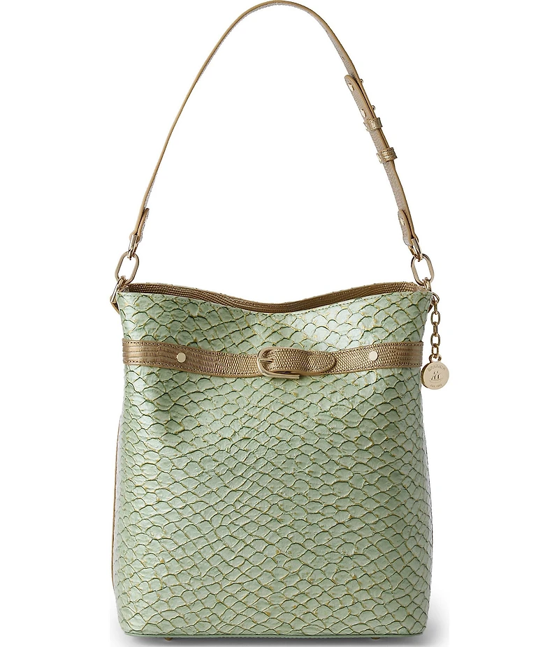 From BRAHMIN, this bucket bag features:  Celina is a trendy new twist on a bucket bag. This has an adjustable shoulder strap and an open top with a bridge closure for easy access to your essentials. The spacious interior has added functionality with a jewelry pocket and key clip for keeping your most precious items secure. Stylish new hardware at the sides gives this added freshness with ease. Mint patent snake embossed leather, gold lizard embossed leather Bridge mag snap closure Adjustable shoulder strap Interior zip pocket Key clip attachment Footed bottom Approx. 9.75" L x 11" H x 5.25" W Approx. 2.13 lbs Imported.