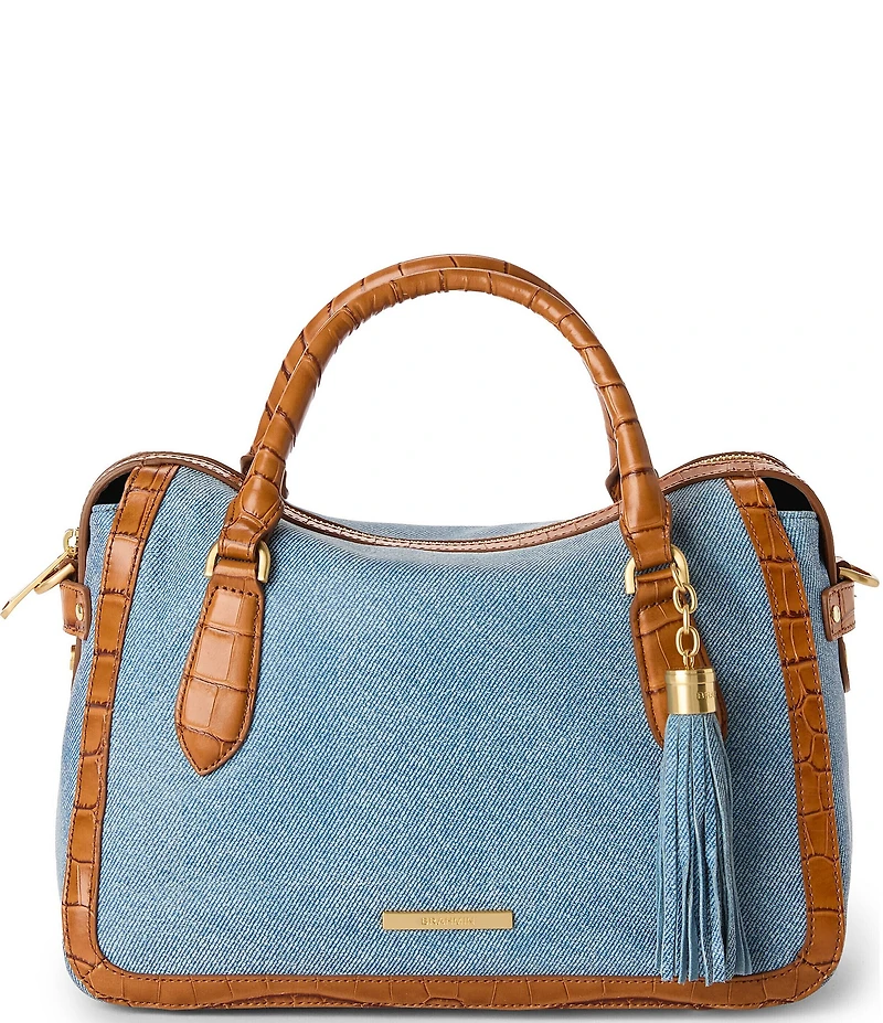 From BRAHMIN, this satchel bag features: Micaela is a soft, slouchy satchel made in smooth nubuck leather for casual construction. Micaela features an adjustable strap that allows you to wear this as a crossbody for maximum versatility. The rolled handles allow for comfort while carrying and bottom feet prevent scuffing. Denim nubuck smooth leather, cognac flat croc embossed leather Brushed gold hardware Zip top closure Back slide in pocket Single kangaroo and pen pocket Interior zip pocket and key clip Bottom feet Rolled handles Attachable, adjustable crossbody strap Approx. 12'' W x 8.25'' H x 5.25'' W Approx. 2.06 lbs Imported.