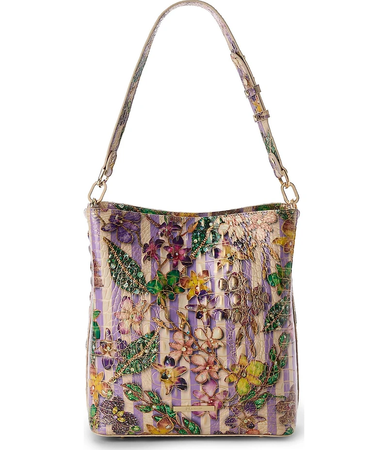 From the Pinstripe Petals Melbourne Collection by BRAHMIN, the Celina Bucket Bag features: Celina is a trendy new twist on a bucket bag. This has an adjustable shoulder strap and an open top with a bridge closure for easy access to your essentials. The spacious interior has added functionality with a jewelry pocket and key clip for keeping your most precious items secure. Stylish new hardware at the sides gives this added freshness with ease. Digital Print Melbourne Leather Bucket bag Bridge mag snap closure Interior zip pocket Key clip attachment Adjustable shoulder strap Footed bottom 9.750'' W x 11.000'' H x 5.250'' D Imported.