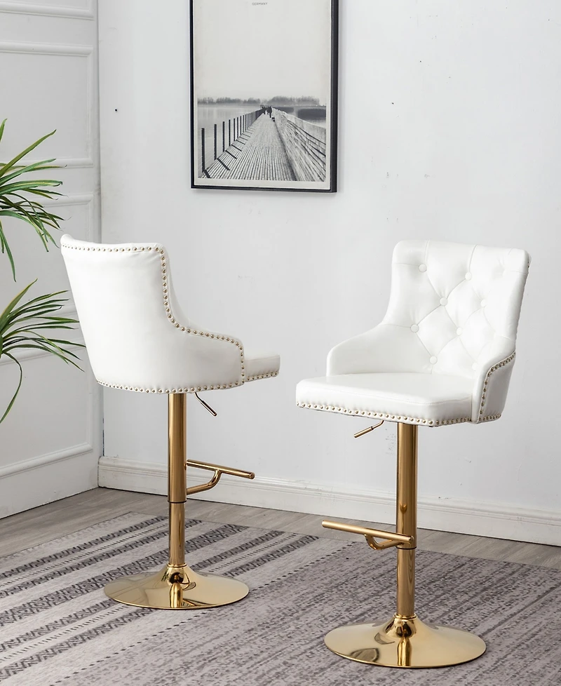 Excite your family and friends with this new glam gold-tone bar stool. This bar stool features a velvet fabric upholstery with a tufted back design. Bar stool has a swivel mechanism and height adjustment for all your seating needs.