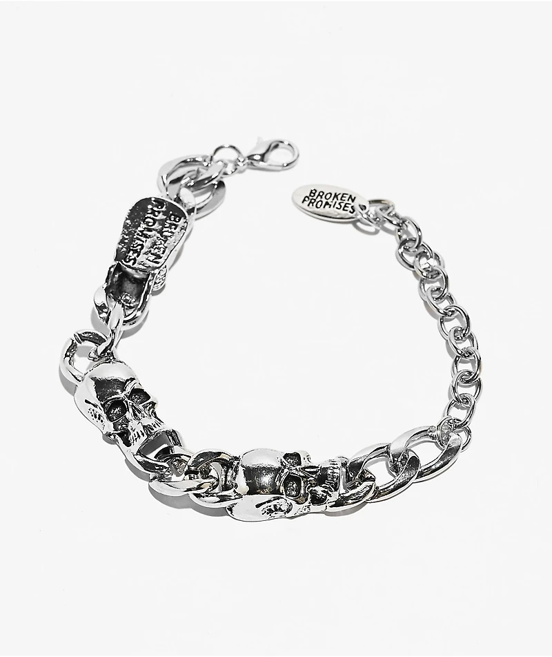 Broken Promises adds bold gothic detail to the Infatuated silver bracelet with three oversized skull beads placed along a thick chain. The 3D molded metallic beads feature debossed branding on the back for that extra lux touch. A silver-plated brass