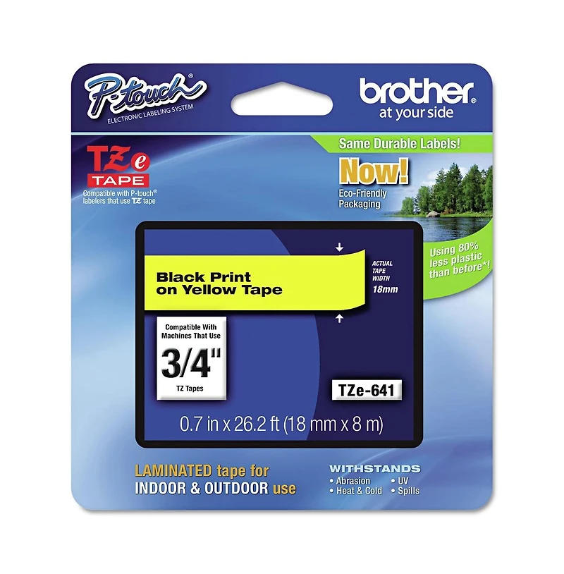 Brother P-Touch TZe641 tape (0.7 in. x 26.2 ft., black on yellow) uses a seven-layer laminated construction for thin, extremely strong labels. Thermal print technology requires no ink or toner, and the split-back design makes labels simple to peel and apply. Laminated tape resists water, grease, grime, fading and abrasion and is ideal for files, binders, shelving and name badges.