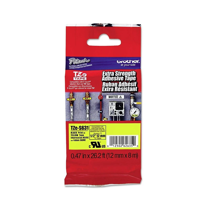 Brother P-Touch TzES631 laminated tape (0.47 in x 26.2 ft, Black on Yellow) delivers professional, high-visibility labels for harsh environments. Heavy-duty polyethylene with extra-strength adhesive-up to twice the hold of standard laminates-sticks to plastics, painted and textured surfaces. The laminated tape endures -50degree(s)C to 200degree(s)C, moisture, chemicals and abrasion, and fits all Brother TZ machines.