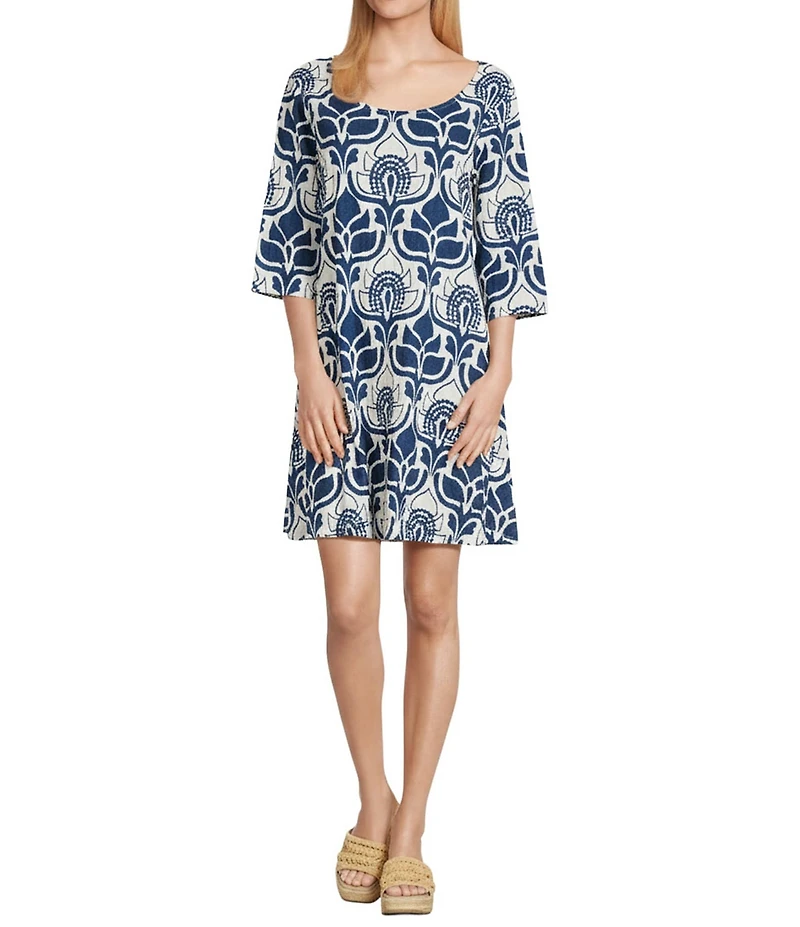From Bryn Walker, this dress features: Woven fabrication Tulum azul cielo print Scoop neckline Elbow sleeves A-line silhouette Straight hem Pullover construction Approx. 37" length Cotton/elastane Machine wash Imported.