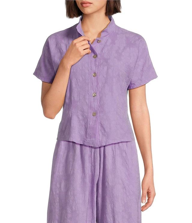 Bryn Walker Jacquard Cotton Floral Mandarin Collar Short Sleeve Coordinating Button Front Shirt