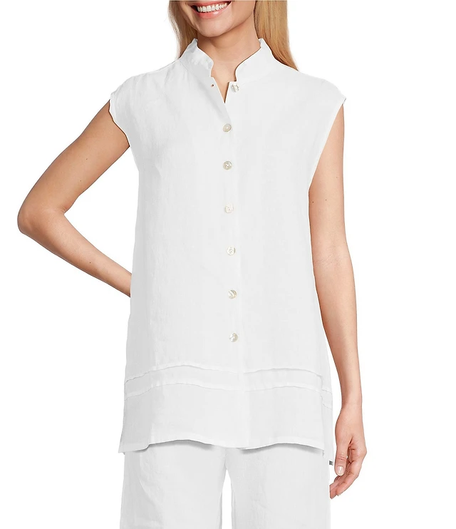Bryn Walker Pintuck Light Linen Mandarin Collar Sleeveless Button Front Tunic