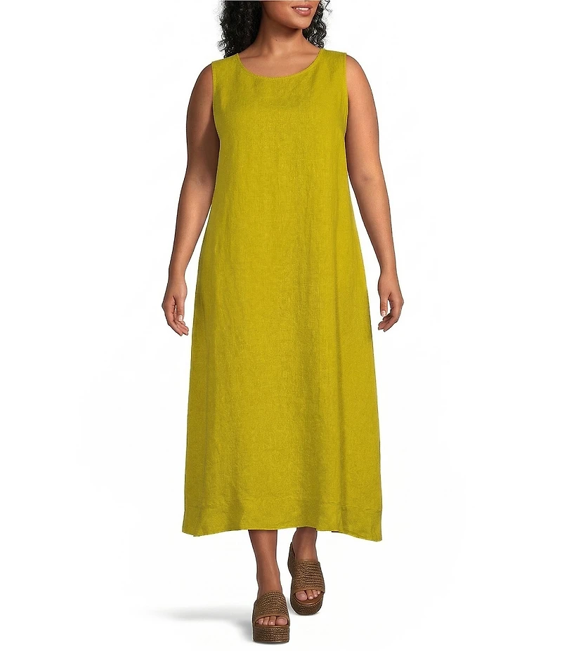 From Bryn Walker Plus, this dress features:  Light linen woven fabrication  Round neckline  Sleeveless  Ruffle hem  Relaxed fit  Pullover construction  Approx. 54.25" length  Linen  Machine wash  Made in the USA.