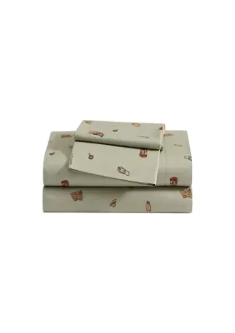 Bring relaxed, outdoor-inspired comfort to your bedroom with the Eddie Bauer buddy Camping all over sheet set. Inspired by classic Camping adventures and Eddie Bauer’s outdoor heritage, this playful allover design features illustrated Camping icons and a loyal trail-ready pup scattered across a soft Fern-green ground, creating a look that feels warm, nostalgic, and effortlessly casual. The charming motifs add character and visual interest while maintaining a clean, balanced aesthetic rooted in outdoor living. Crafted from crisp printed 100% cotton percale, these sheets offer a smooth, breathable feel that stays cool and comfortable for year-round use. The lightweight construction delivers a fresh, hotel-style sleep experience, while the natural cotton fibers enhance airflow and durability. The flat sheet and pillowcases drape with a relaxed yet polished finish, and the fitted sheet features fully elasticized edges and deep pockets for a secure fit on mattresses up to 15 inches deep. Perfect for cabins, kids’ rooms, guest bedrooms, or anyone who loves adventure-inspired décor, this sheet set layers effortlessly with quilts, comforters, or duvets. Designed for everyday comfort and long-lasting performance, it reflects Eddie Bauer’s commitment to functional design and timeless outdoor style. Includes one flat sheet, one fitted sheet, and one pillowcase (twin). Machine washable for easy care and everyday use. 4-Piece Set Soft 200 Thread Count Novelty India Imported Product Specifications Queen Flat Sheet: 90"W x 102"L, Queen Fitted Sheet: 60"W x 80"L, Standard Pillowcases: 30"W x 20"L Material & Care Cotton Machine washable