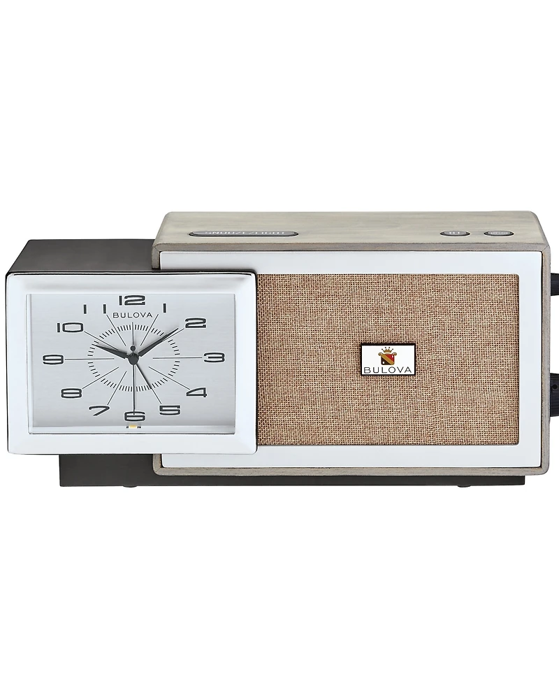 Bulova's retro-inspired clock radio is housed in solid American Ash and finished in a washed silver stain. The speaker case has a genuine speaker cloth front cover to shape the excellent audio sound. Inspired by Bulova's 60s design.