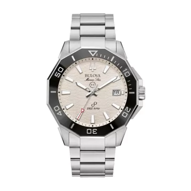 An incredibly bold design, this men's Bulova marine star precisionist sports watch pushes the limits with Bulova's cutting-edge technology and a strikingly modern case. Defined by a rugged, angular profile, the 43mm stainless steel case features brushed facets and polished accents, with a unidirectional timing bezel with a ceramic insert, a sapphire crystal, and a screw-down crown ensuring 200m water resistance.