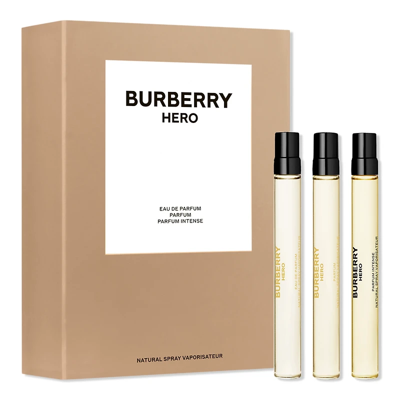 HR DP 10ML + PRFM 10ML + PRFM NTS 10ML. Fragrance Family: Woody. Key Notes: Top- Pine needle. Heart- Benzoin. Base- Cedarwood trio. Includes: Burberry Hero Eau de Parfum Travel Spray (0.33 oz). Burberry Hero Parfum Travel Spray (0.33 oz). Burberry Hero Parfum Intense Travel Spray (0.33 oz).
