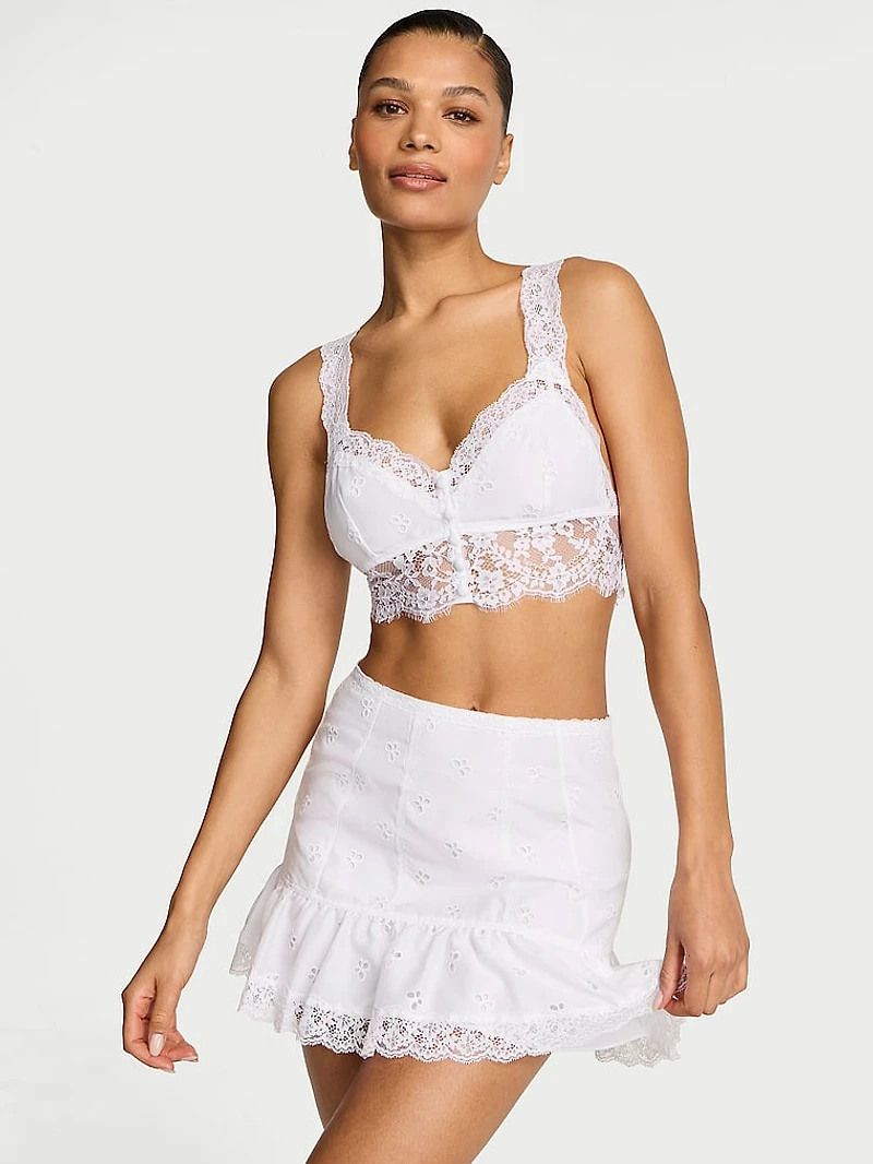 Effortlessly romantic, eyelet is a quintessential summertime staple. Ours is airy, whisper-light, and edged in sumptuous lace—the ideal option for hot days and steamy nights. On its own, this Mini Skirt is a stunner; pair with the matching Bralette for the full-on-flirty ensemble.