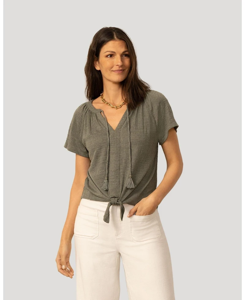 An easy warm weather top designed with texture and feminine detail. The lightweight Gramercy Crinkle knit offers natural stretch and breathable comfort, while the split neckline with tie accent creates a relaxed yet polished look. Delicate embroidery adds subtle dimension, and the adjustable tie hem allows for a customized fit with a softly bloused effect. Perfect for pairing with shorts, denim, or casual trousers, this piece delivers effortless style for sunny days.