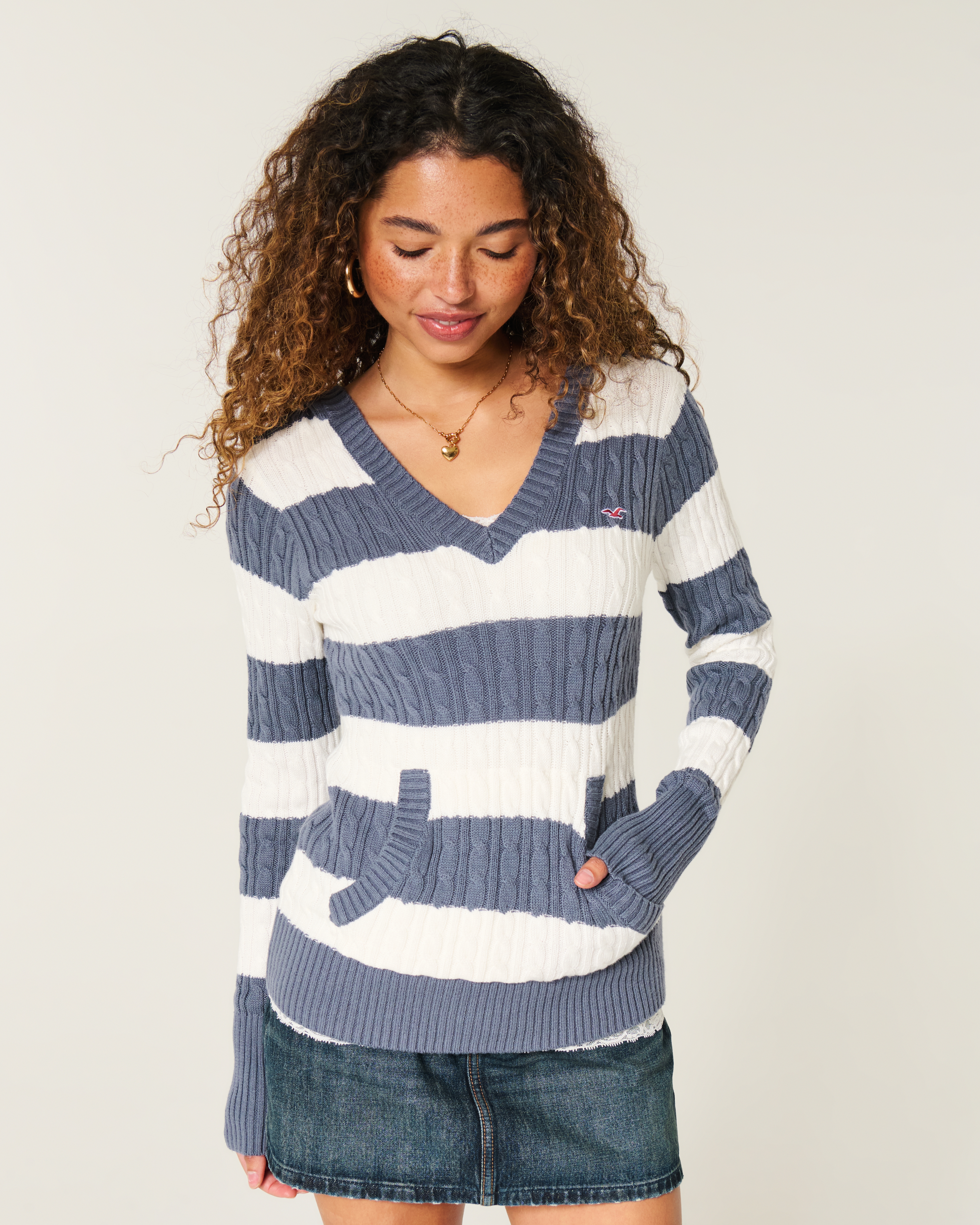 Cozy and super soft, this sweater features classic cable-knit patterns and a hood. Front pouch pocket, embroidered left chest logo icon, ribbed trims, v-neckline, long sleeves. Slim Fit. Imported.