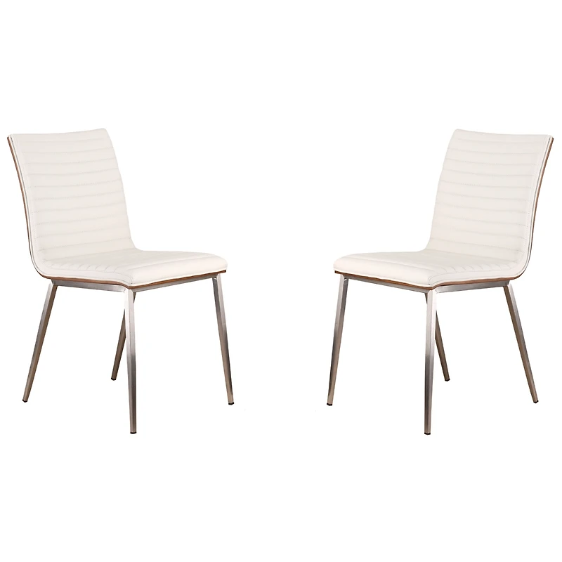 The Armen Living Cafe contemporary dining chair is a perfect statement piece for any modern dining room. This clean, elegant chair combines a Artificial leather upholstered, walnut veneer seat with an exquisite brushed stainless-steel frame. This wonderful combination of top of the line materials makes the Cafe a standout piece. This is simple but add a luxurious feel and design to any room in your home. The medium high cushion back is ideal for posture alignment and an unmatched support for days on end. The smooth and soft upholstery will keep you at ease all day, with detailed horizontal lines stitching for texture look and feel. The accent walnut back add to the overall modern look with a contemporary flare. The foundation of the product is supported by brushed stainless steel for a sturdy and modern look without comprising practicality and functionality of this item. This item is a versatile piece that can be ideal for dining, kitchen or even home office desk chairs. This product ships in one box with easy and quick set up. We stand by the quality, the craftsmanship and the integrity of our product by offer 1-year warranty for all our products. While perfect when set around a table, this versatile and stylish piece of furniture can easily double as additional seating in any room in the house. The Cafe is available in gray and white. Product Dimensions: 17""W x 22""D x 34""H.