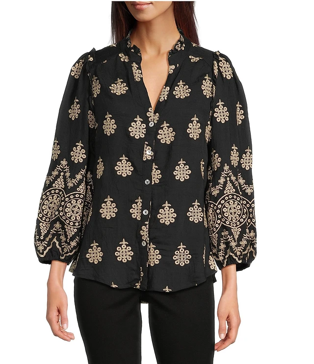 Calessa Embroidered Medallion Print Split V-Neck Bracelet Length Sleeve Button Front Tunic