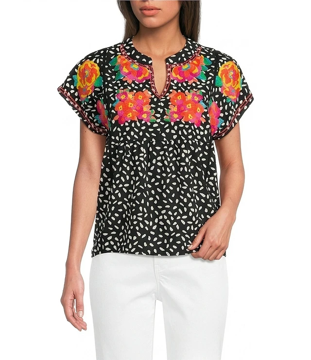 Calessa Petite Size Embroidered Polka Dot Floral Split V-Neck Cap Sleeve Blouse