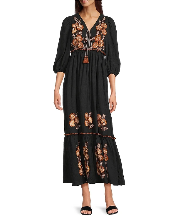 Calessa Petite Size Embroidered Tassel Tie V-Neck 3/4 Sleeve Tiered Maxi Dress