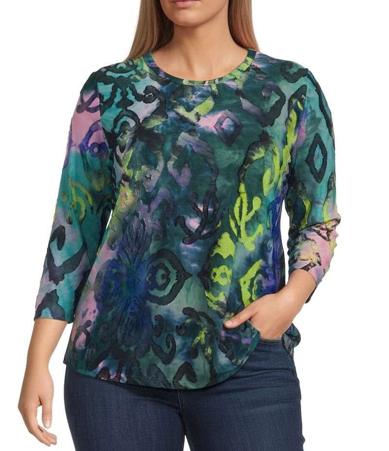 Calessa Plus Size Burnout Tie-Dye Crew Neck 3/4 Sleeve Asymmetric Hem Tunic
