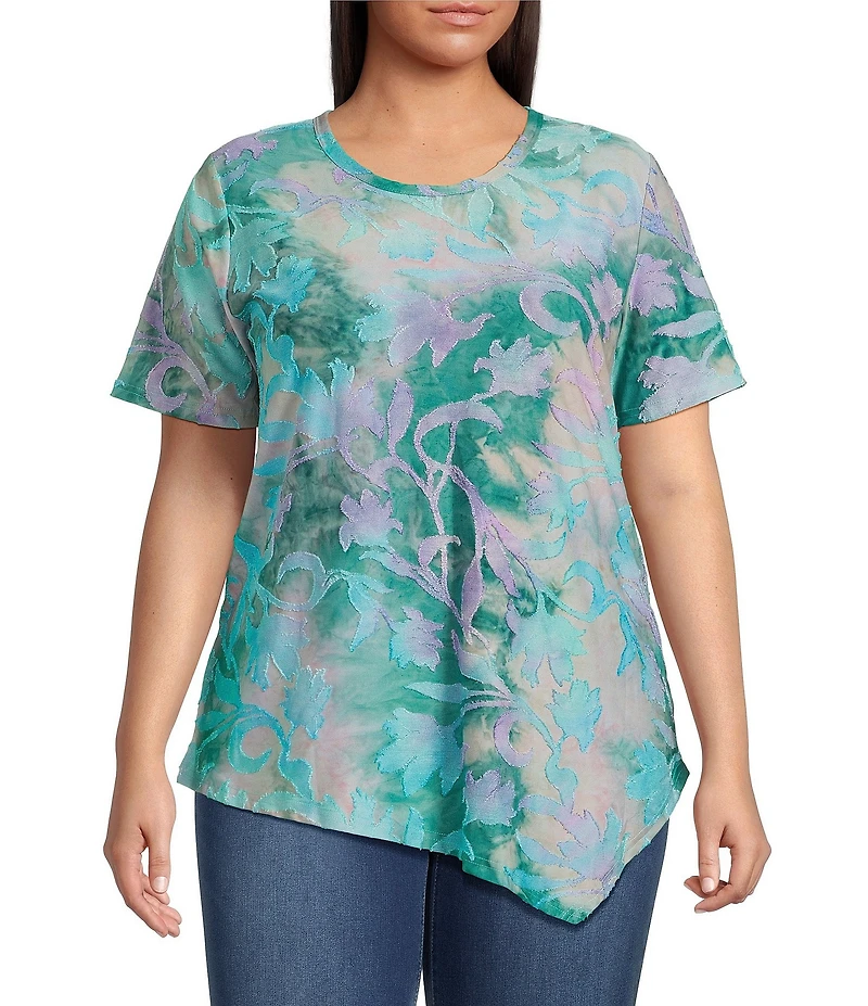Calessa Plus Size Burnout Tie-Dye Crew Neck Short Sleeve Asymmetric Tunic