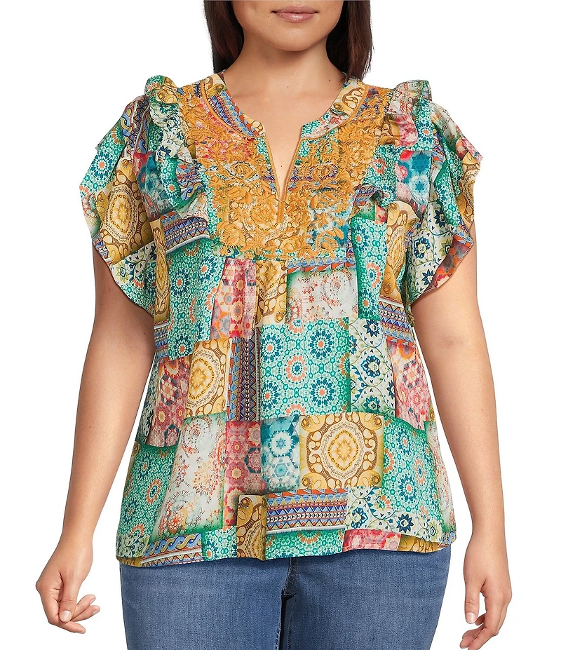 Calessa Plus Size Embroidered Modern Mosaic Print Ruffle Sleeve Tunic