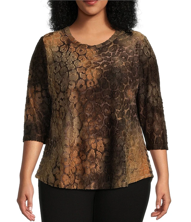 Karen Kane Plus Size Burnout Tie-Dye Crew Neck 3/4 Sleeve Top