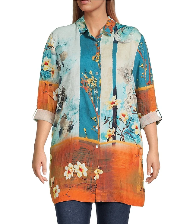 Calessa Plus Size Woven Border Leaves Print Point Collar Roll-Tab Sleeve Button Front Duster Tunic