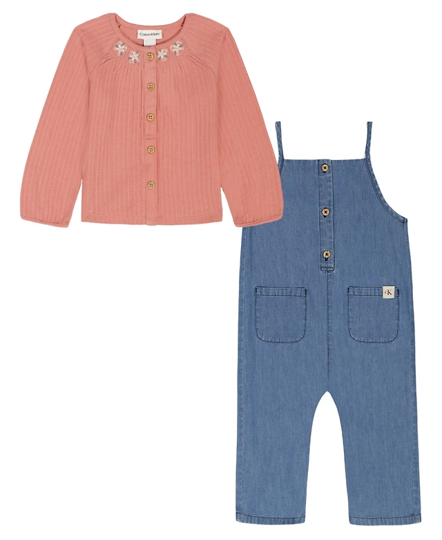 Calvin Klein Baby Girls 2-Piece Pointelle Rib Top and Denim Jumpsuit Set