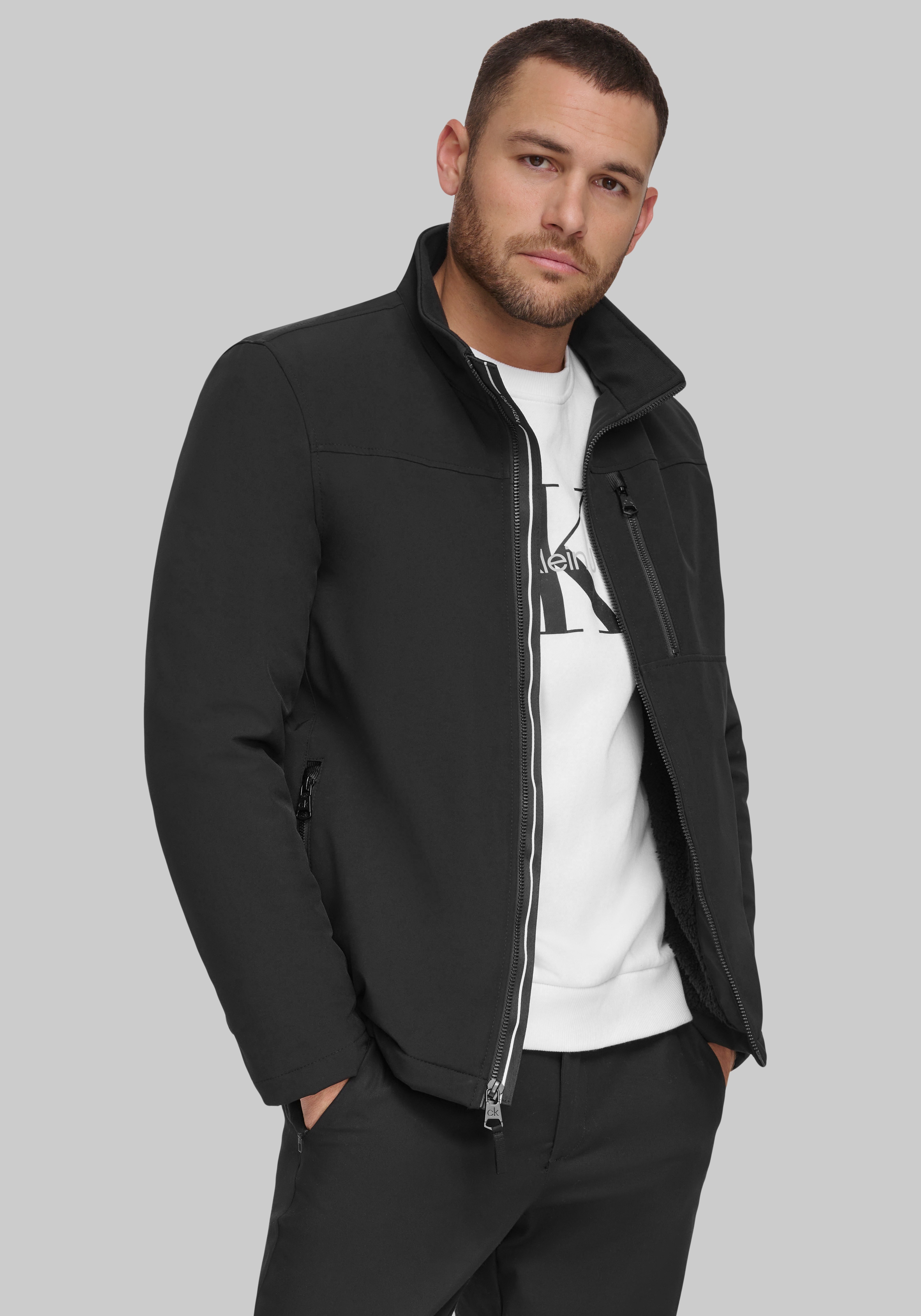 A cozy update to a classic silhouette, this Calvin Klein soft shell jacket features a warm sherpa lining for added insulation and comfort. The sleek exterior offers wind and water resistance, while the Tailored Fit keeps your look sharp. Ideal for chilly days when you need both function and style.