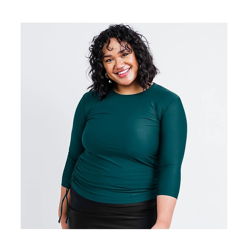 Hit the waters in style with the Margaux Swim Top. Its 3/4 sleeves and high neckline offer elegant coverage, while side ruching flatters your figure. Crafted with Upf 50+ fabric and quick-dry technology, it's ideal for every sunny adventure. For the best fit, size up if uncertain.