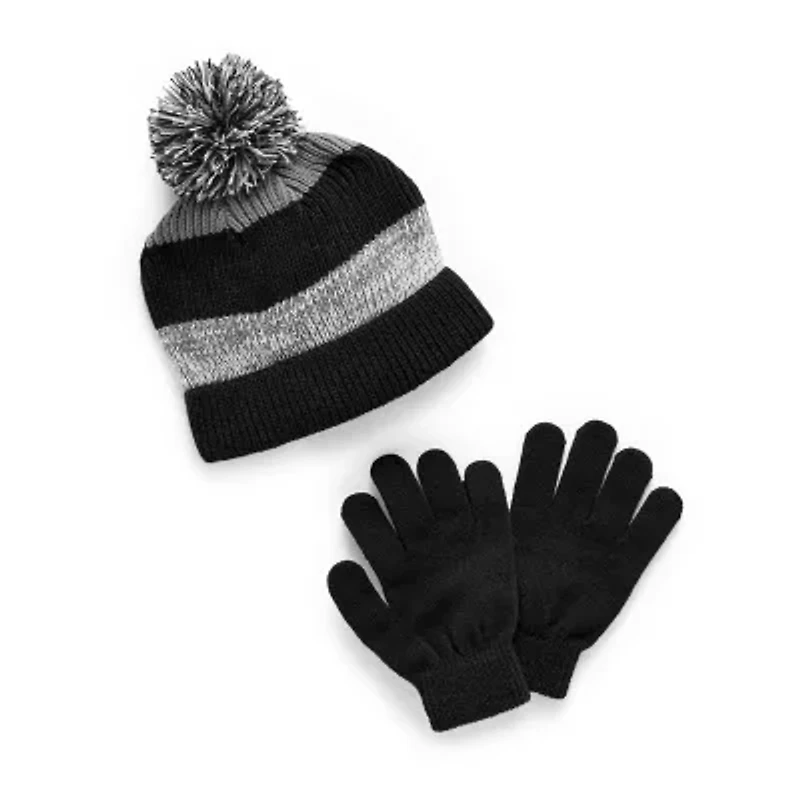 This Capelli of N.Y. little and big boy's 2-piece cold weather set will equip him with the accessories to stay warm. Made from soft knit, this combo includes a printed, cuffed pom pom beanie and a pair if gloves to keep him cozy head-to-toe.