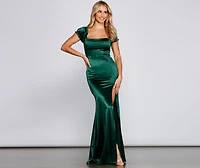 Make a mesmerizing entrance with a formal dress that stuns from the moment you walk in. Capri features a square neckline, short puff sleeves, and an A-line silhouette with a daring high slit. The dress is composed of a lined satin fabric that offers a form hugging fit with minimal stretch. Complete look with rhinestone heels and an anklet.