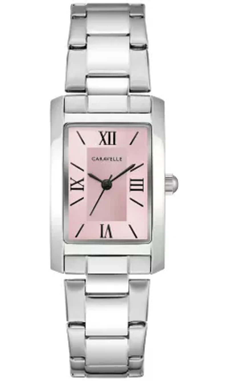 Look pretty in pink all year long with this charmingly elegant Caravelle women’s watch. At once bold and refined, the silver-tone stainless steel case is polished throughout while a curved mineral crystal maintains the stylish silhouette. Printed black Roman numeral and baton markers are complemented by black sword hands that provide stunning contrast against the radiant split-finish pink dial. The watch transitions seamlessly to the matching silver-tone bracelet, which features a push-button folding closure for exemplary comfort. An everyday essential that can be dressed up or down, this Caravelle ladies’ timepiece is the perfect addition to any collection. Foldover clasp Analog dial Quartz movement Choking hazard Warranty available, Limited liability warranty, 3 Years Limited liabilty warranty Imported Product Specifications 33mmx21mm 21mm Material & Care Metal, Stainless steel Clean with a damp cloth or soft brush.