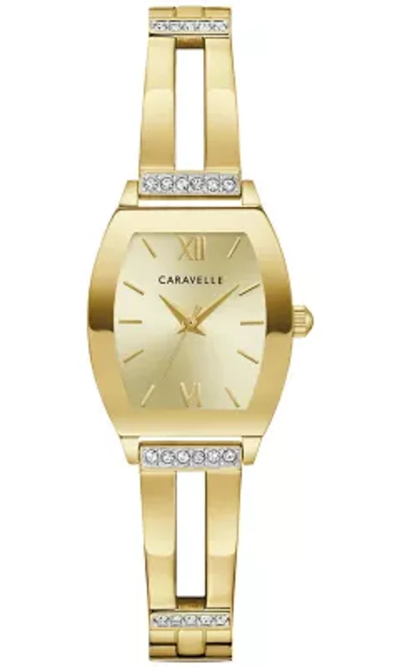 Show your confidence with this remarkable Caravelle women’s timepiece. Defined by a graceful silhouette, the gold-tone stainless steel case features an edge-to-edge metallized curved mineral crystal, while applied gold-tone hour markers enhance the sunray finish of the radiant champagne dial. A matching gold-tone expandable bangle ensures an ideal fit on any wrist, with 24 crystals that elevate the entire watch. Positively stylish and effortlessly bold, this Caravelle ladies’ timepiece is an unapologetic statement of refinement. No clasp, 24 Analog dial Quartz movement Choking hazard Warranty available, Limited liability warranty, 3 Years Limited liabilty warranty Imported Product Specifications 30.5mmx22mm 22mm Material & Care Metal, Stainless steel Clean with a damp cloth or soft brush.