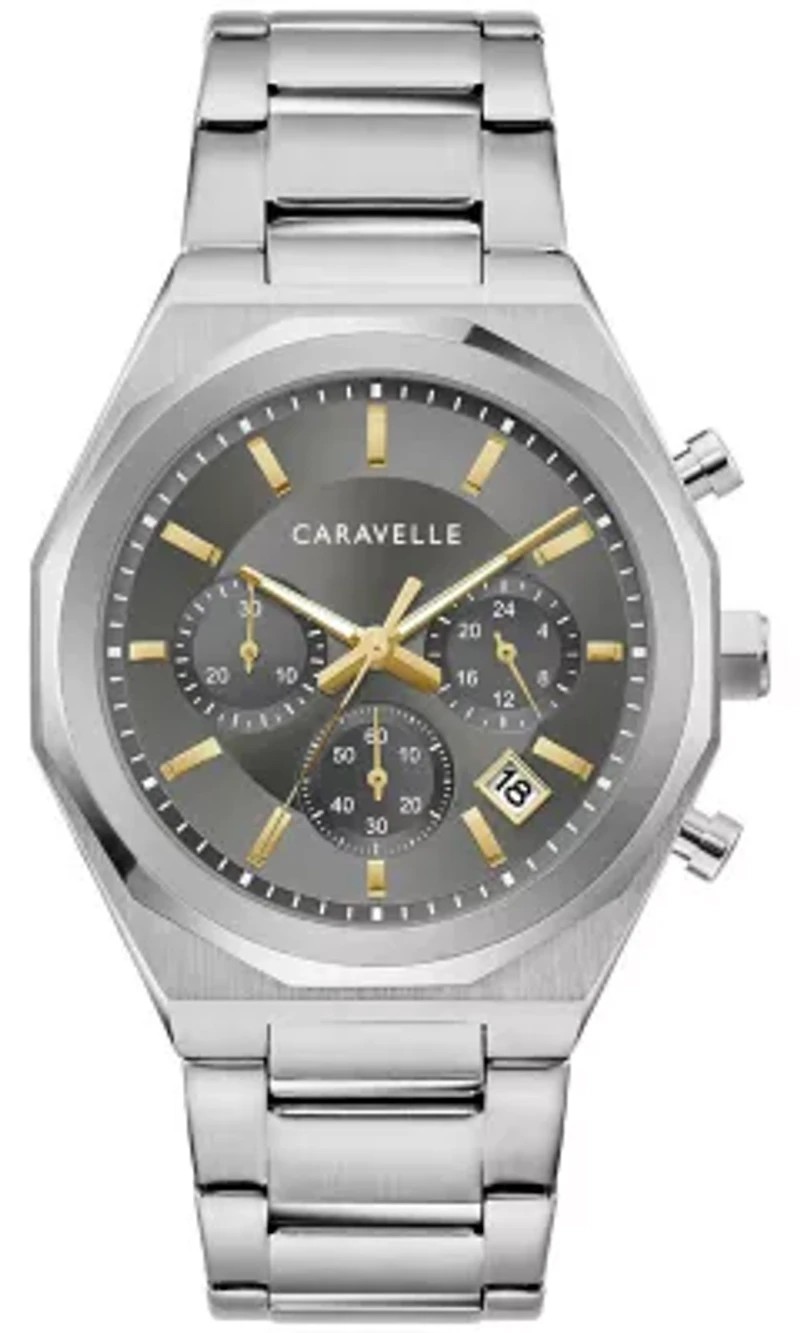 This Caravelle men’s 6-hand chronograph features elevated style and uncompromising functionality. The angular silver-tone stainless steel case features a dynamic brushed finish with polished accents with a matching multi-link bracelet with a foldover clasp. The fascinating gray dial offers a balance of complementary finishes, gold-tone indices and hands with luminous fill, and a framed date display. The recessed subdials continue the gold-tone accents and feature seconds and 30-minute chronograph counters and a 24-hour display. A Caravelle men’s timepiece as practical as it is fashionable. Foldover clasp Analog dial Quartz movement Date display Choking hazard Warranty available, Limited liability warranty, 3 Years Limited liabilty warranty Imported Product Specifications 47mmx40mm 40mm Material & Care Metal, Stainless steel Clean with a damp cloth or soft brush.