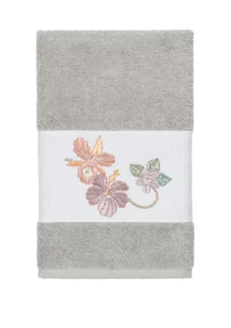 The Caroline Embellished Hand Towel by Linum Home Textiles features lyrical orchids and plumeria flowers in embroidery on a woven textured border. This soft and luxurious towel is made of genuine premium Turkish cotton and offers lasting absorbency and superior durability. Available in a range of lovely towel colors Embellished in USA Warranty available Made in Turkey Imported Product Specifications 16 in x 30 in Material & Care Superbly absorbent, quick-drying fabric Cotton Machine washable