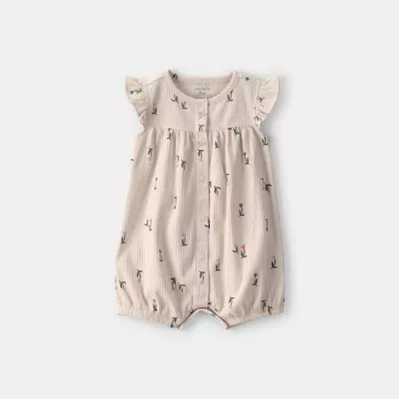 Update your baby girl's everyday basics with this sweet floral-print romper by Carter's. Made from a ribbed cotton-knit, this one-piece has short flutter sleeves, a relaxed bubble shape for comfortable movement and snap closures.