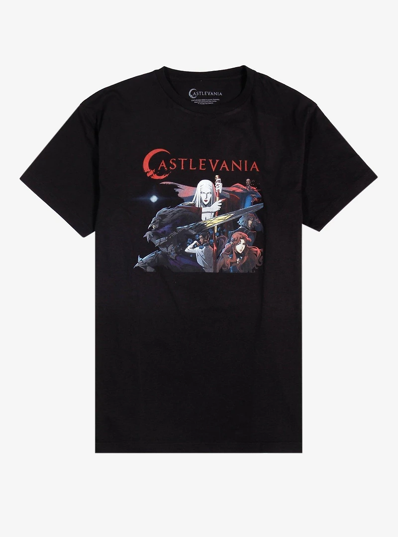 This Castlevania tee shows a collection of characters like Carmilla, Isaac, Hector and other shady figures from the series, with a sword going through the graphic.
