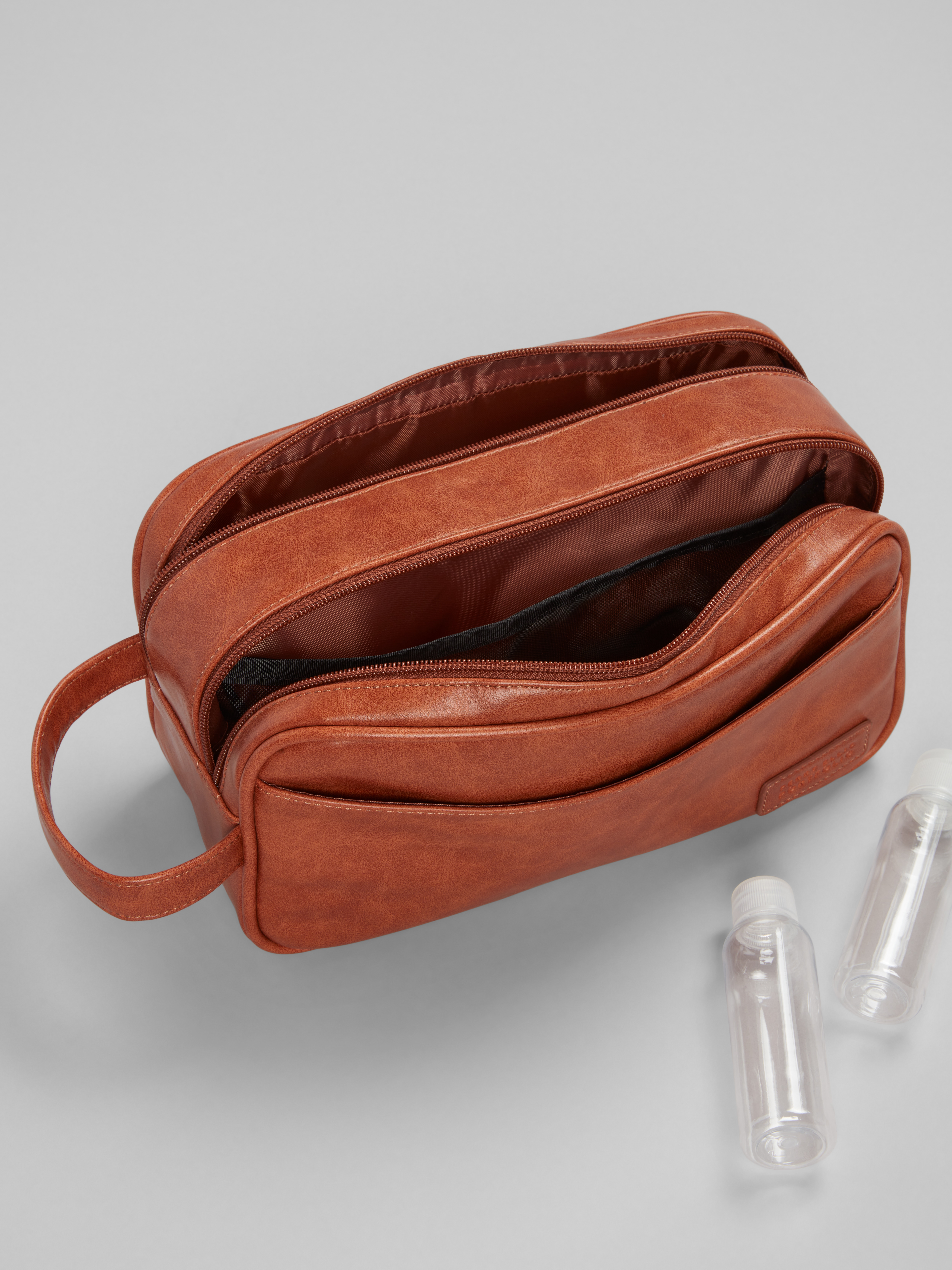 Crafted from leather, this Perry Ellis travel kit offers a practical and stylish solution for organizing your essentials on the go. Designed with convenience in mind, it provides ample space for toiletries or small necessities. Its durable construction makes it an ideal companion wherever your journeys take you.