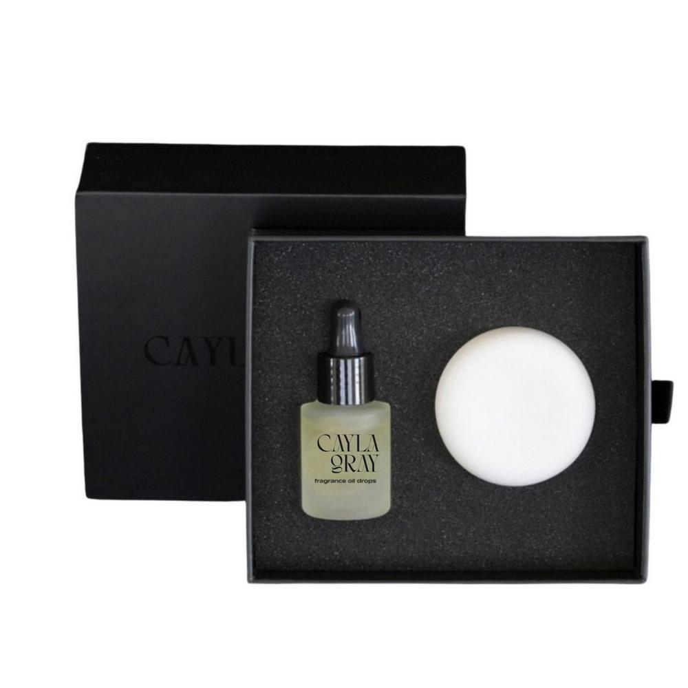 Scentstone Set. Features: Clean, non-toxic, transparent ingredients. A minimalist stone diffuser that gently scents any space with your favorite Cayla Gray fragrance. Perfect for home, desk, or car. Each set includes one scent stone, one 0.5 oz fragrance oil, and a black gift box.. Fragrance Family: Vanilla / Clean. Key Notes: Sweet Vanilla, Musk, Tonka Bean, Sheer Linen.