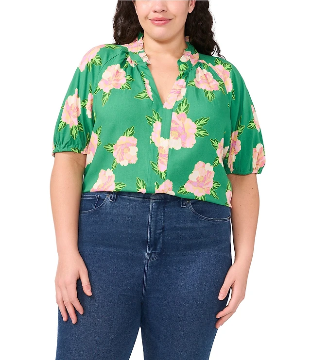 CeCe Plus Woven Floral Print Round Neck Short Puff Sleeve Blouse