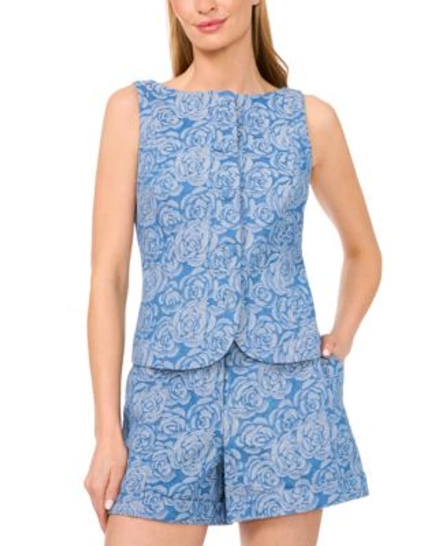 Cece Womens Floral Jacquard Denim Button Front Vest Belted Floral Jacquard Denim Shorts