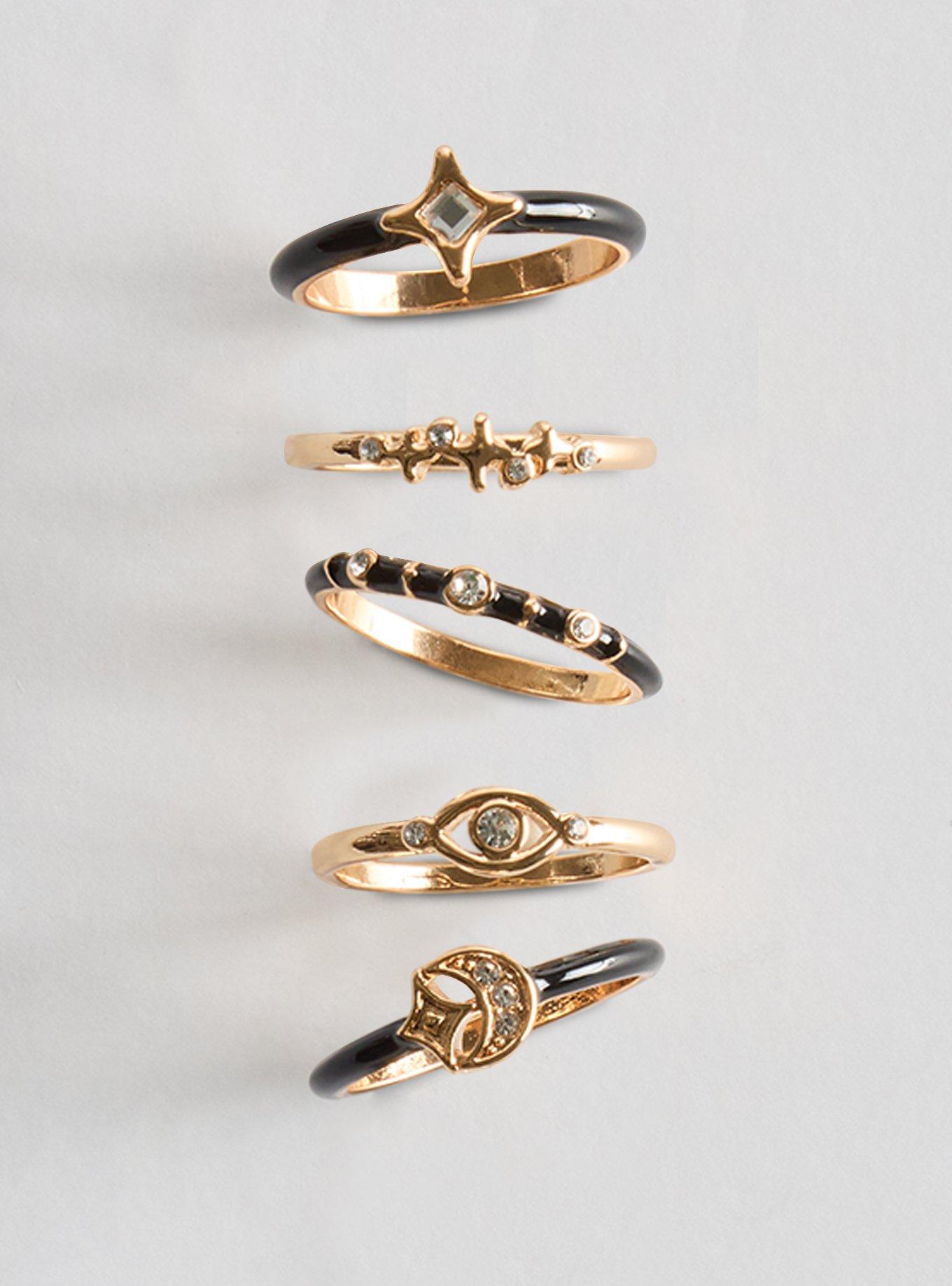 FIT Sizes 8-12 MATERIALS + CARE Man-made materials. Wipe clean with cloth. Imported. DETAILS High shine finish. Set of 5 rings. Celestial details.
