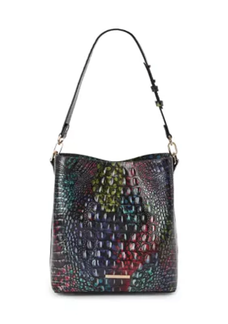 Celina is a trendy new twist on a bucket bag. This has an adjustable shoulder strap and an open top with a bridge closure for easy access to your essentials. The spacious interior has added functionality with a jewelry pocket and key clip for keeping your most precious items secure. Stylish new hardware at the sides gives this added freshness with ease. Bucket bag Bridge mag snap closure Adjustable shoulder strap Center zip divider pocket Interior zip pocket with key clip Single kangaroo and pen pocket Jewelry pocket Bottom feet Imported Product Specifications 9.75'' W x 11'' H x 5.25'' D Material & Care Leather Clean with a soft cloth