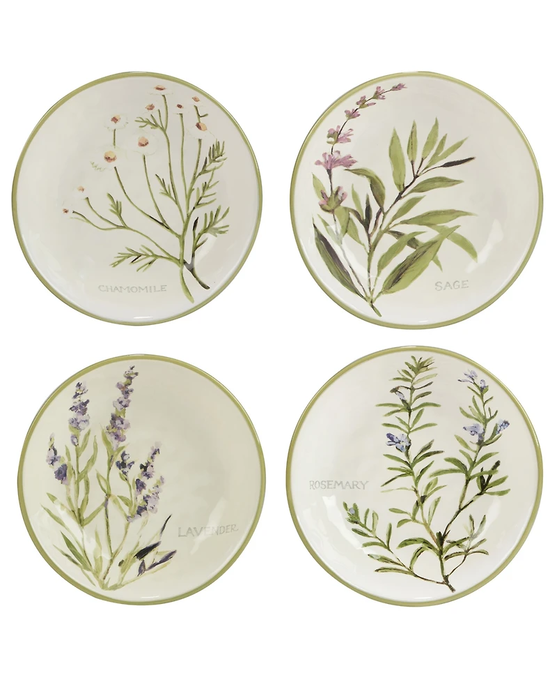 Beautiful green herbs with colorful accents decorate Certified International Fresh Herbs Soup Bowl Set. 4 different culinary and aromatic herbs such as sage, rosemary, chamomile and lavender adorn these 4 assorted ceramic soup bowls.