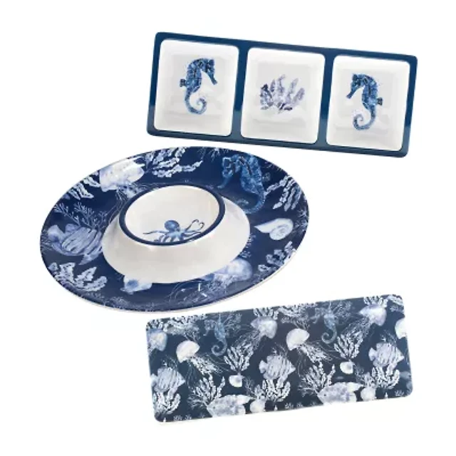 Embark on a nautical adventure with the sea life 3pc host set, where the treasures of the ocean floor come to life on your dining table. This set, consisting of a chip & dip 14.5", a 3-section relish tray 14.5" x 5.75", and a rectangular platter 19" x 8", is crafted from dishwasher safe 100% melamine, offering both resiliency and a captivating deep-sea aesthetic. Each piece is designed to transport you and your guests to an underwater world, making your hosting both imaginative and effortless. Ideal for mixing and matching with other dinnerware and serveware items in this unique collection, the sea life host set is a must-have for those who appreciate the ocean's boundless beauty.