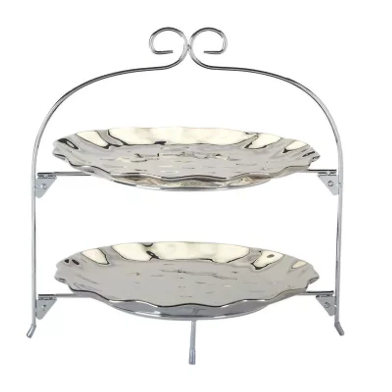 The silver coast 2 tier rack with porcelain 11-inch plates is a stunning piece of serve ware that combines functionality with sheer elegance. This two-tiered server is a perfect blend of contemporary style and classic sophistication, making it an ideal addition to any host's collection. The sleek silver finish of the plates provides a neutral backdrop that highlights the colors and textures of the food served, from delicate pastries to vibrant appetizers. The reflective surface not only adds a touch of glamour but also creates a dynamic table display as it catches the light. Please handwash and do not use in the microwave.