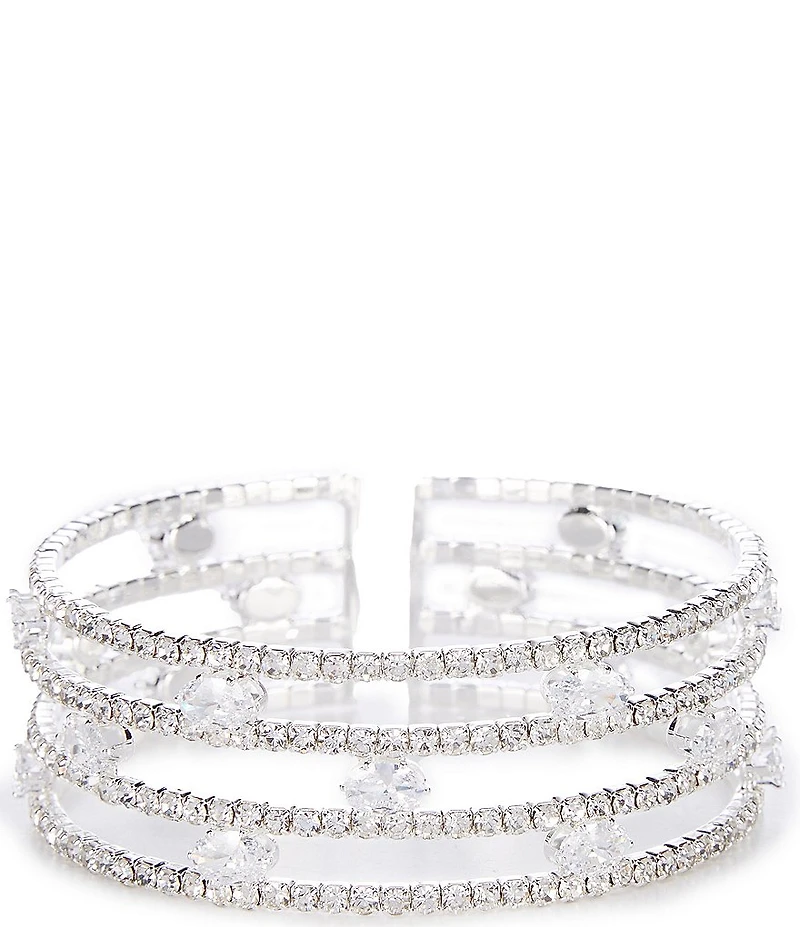 From Cezanne, this bracelet features: Cuff bracelet Plated hardware Clear rhinestones Stretch, no closure Approx. 7.5" length Imported.