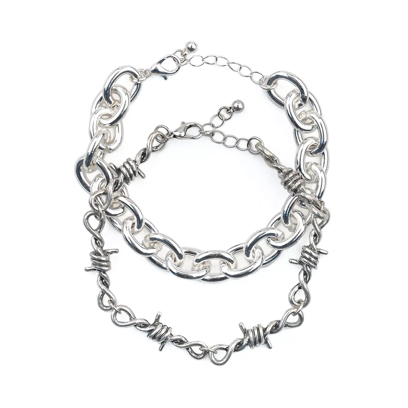 Chain Link and Barbed Wire Silver-Tone Bracelets - 2 Pack